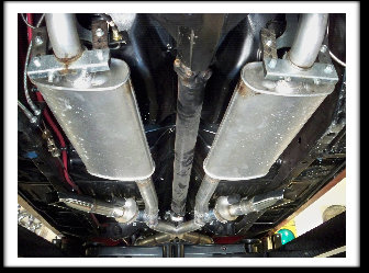 Undercarriage exhaust system, showing solenoid-controlled cutouts. Very cool, very loud.